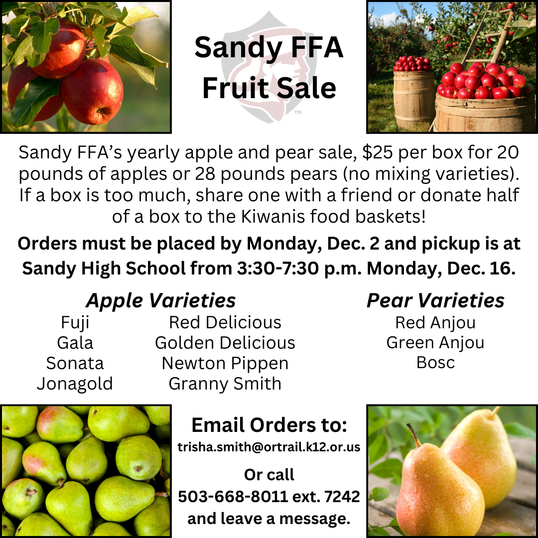 Sandy FFA’s yearly apple and pear sale, $25 per box for 20 pounds of apples or 28 pounds pears (no mixing varieties). If a box is too much, share one with a friend or donate half of a box to the Kiwanis food baskets!